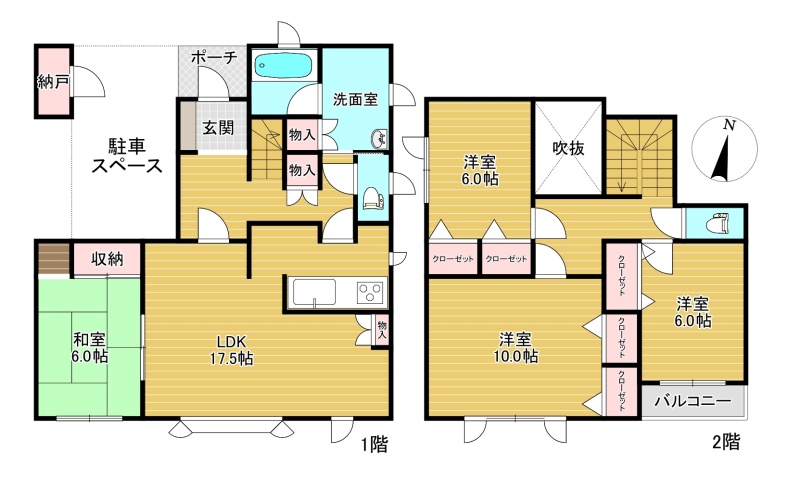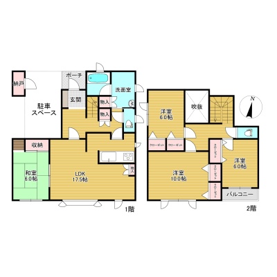 | 間取り | 4LDK1階:LDK17.5帖 和室6帖 / 2階:洋室10帖 洋室6帖 洋室6帖 |