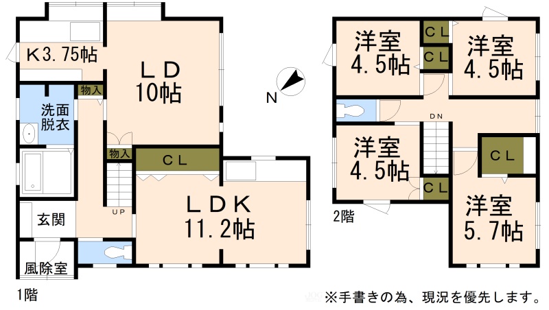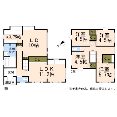 | 間取り | 二世帯型1階:LDK13.75帖 LDK11.2帖 / 2階:洋室5.7帖 洋室4.5帖 洋室4.5帖 洋室4.5帖 |