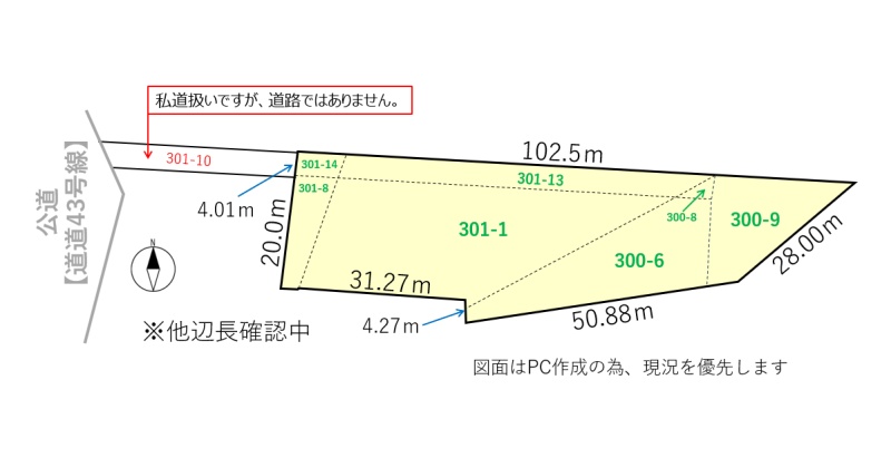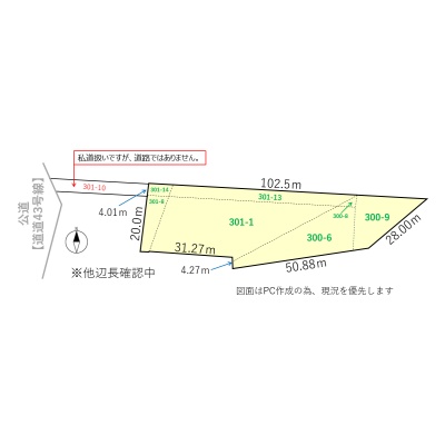 備考 ◆接道なし(301番10は私道扱いですが、道路ではありません。) ◆平成4年11月当時の給水管のため、建物の建築時には新たに給水管の引き直しが必要となります。 学区色がついているアイコンをクリックすると、本物件までの道順を見ることができます。
