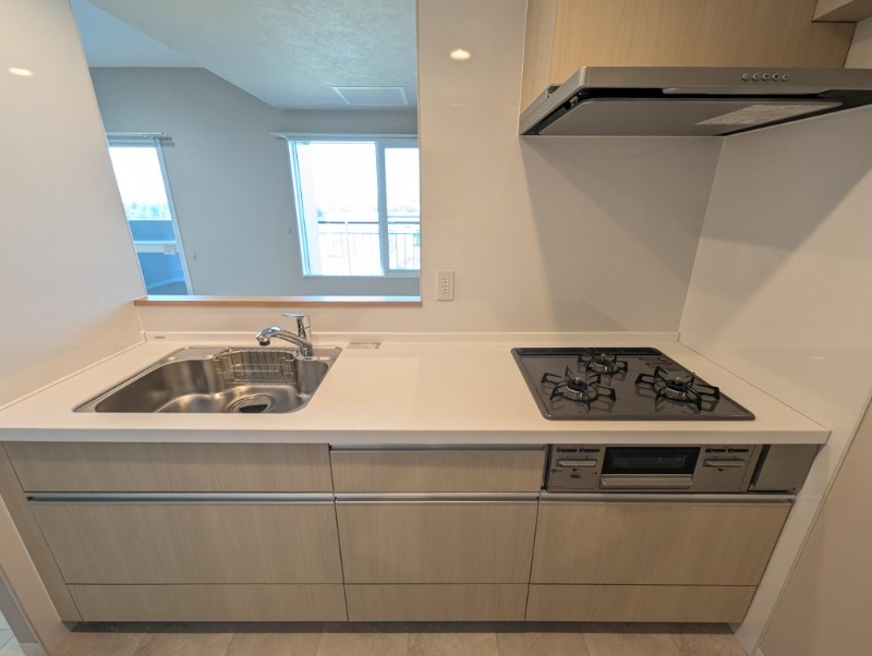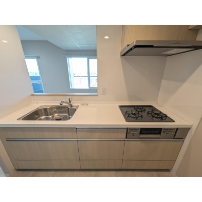 キッチン:3口コンロに収納たっぷりのシステムきっちんです◎