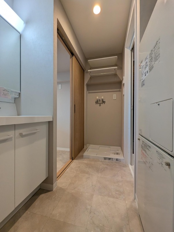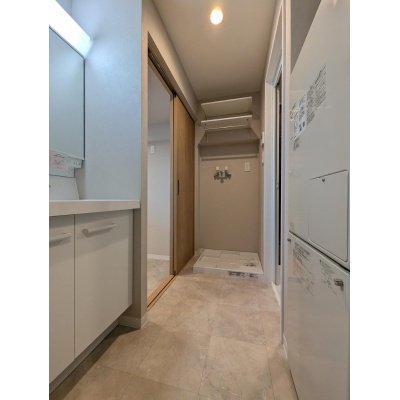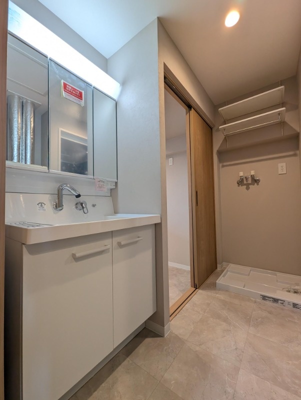 洗面台・洗面所:洗濯機置場の上には便利な収納棚が◎