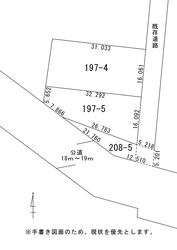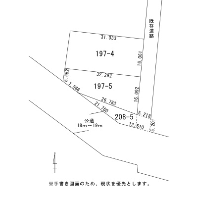 備考 境界非明示・契約不適合責任免責 南側幅員18~19m 公道に約37.292m接道 東側幅員不明 既存道路に約37.354m接道 地番:208-5の一部が既存道路に入っています。面積不明。 学区色がついているアイコンをクリックすると、本物件までの道順を見ることができます。