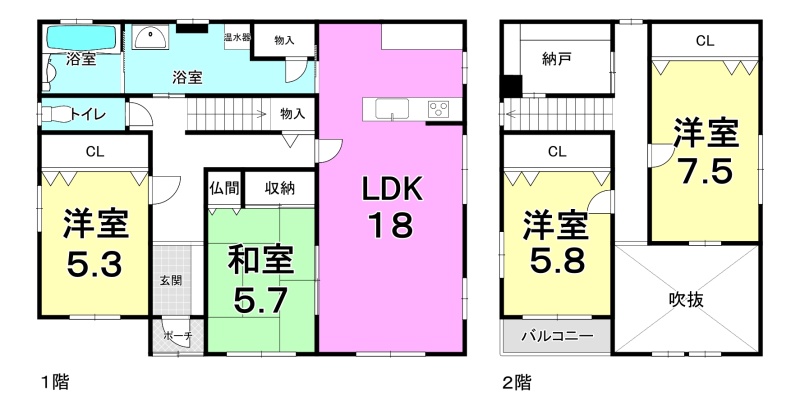 | 間取り | 4SLDK1階:LDK18帖 和室5.3帖 洋室5.3帖 / 2階:洋室7.5帖 洋室5.8帖 |
