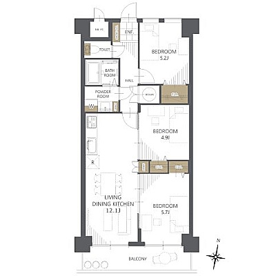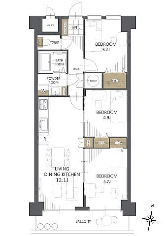 3LDK(64.4m²)└ LDK12.1帖 洋室5.2帖 洋室4.9帖 洋室5.7帖