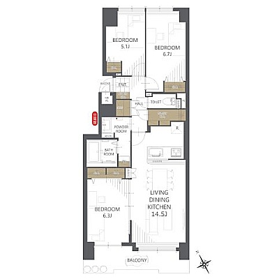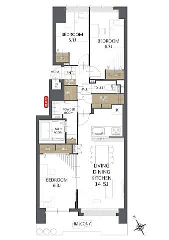3LDK(75.88m²)└ LDK14.5帖 洋室6.7帖 洋室6.3帖 洋室5.1帖