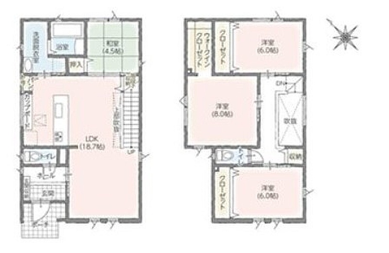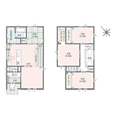 | 間取り | 4LDK1階:LDK18.7帖 和室4.5帖 / 2階:洋室8帖 洋室6帖 洋室6帖 |