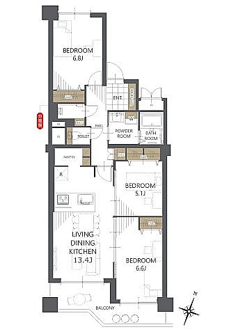 3LDK(74.84m²)└ LDK13.4帖 洋室6.6帖 洋室5.1帖 洋室6.8帖