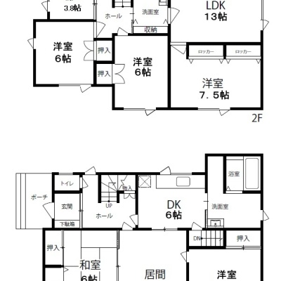 | 間取り | その他1階:LDK16帖 洋室8帖 和室8帖 / 2階:LDK13帖 洋室6帖 洋室6帖 S3帖 / その他:洋室7.8帖 |