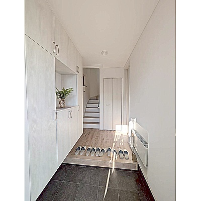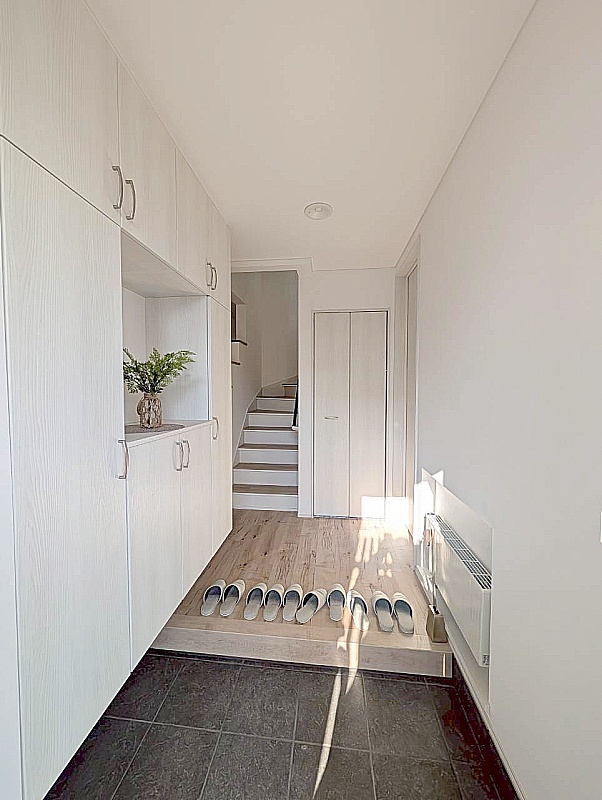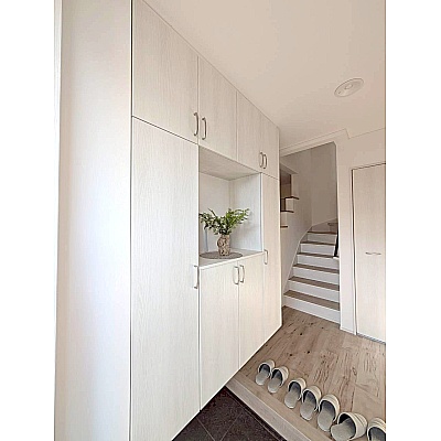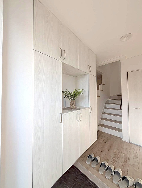 白を基調にした玄関で、清潔感のあるやさしい雰囲気です。 帰宅時にほっとできる明るい印象です。