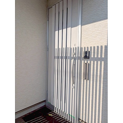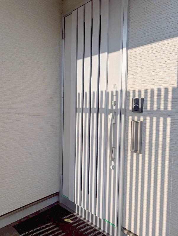 明るい外観に馴染む玄関ドア。 帰宅時に気持ちよく迎えてくれる印象です。