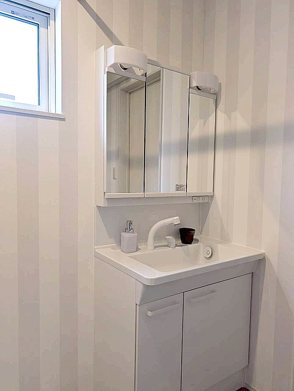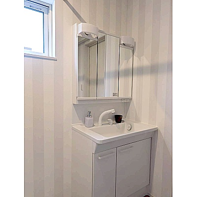 洗髪洗面化粧台を備えた明るい洗面所。 窓があり、自然換気ができて清潔に保ちやすい空間です。