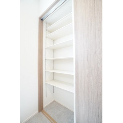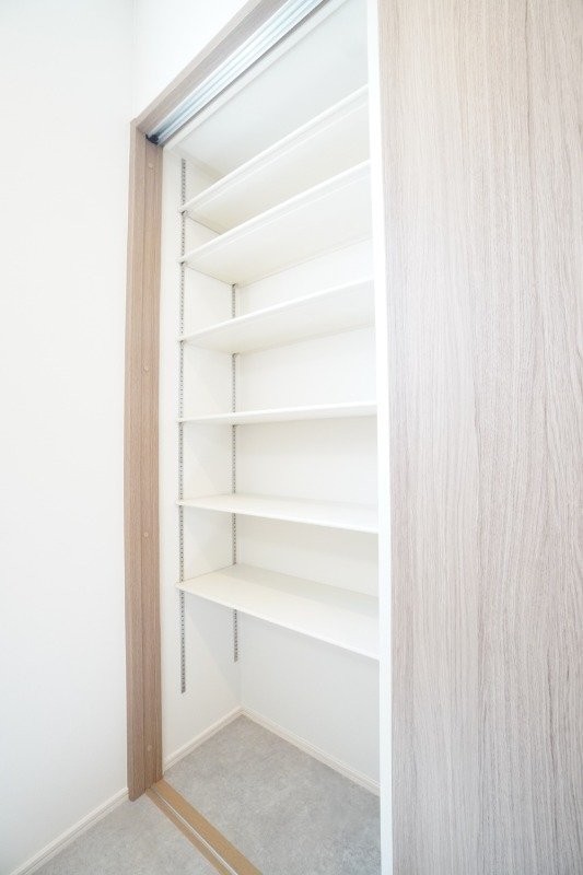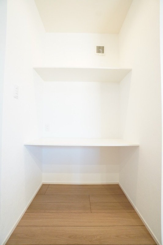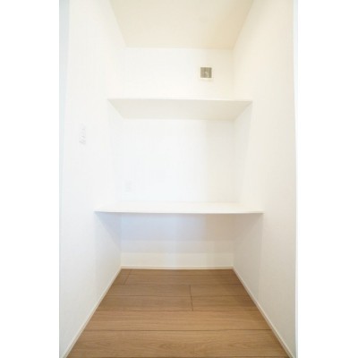 キッチン横の収納棚。荷物の一時置きや、ちょっとした家事スペー