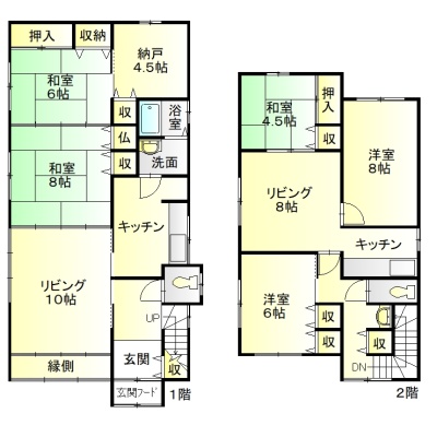 建物の階建 地上2階建 構造 木造 間取り 二世帯型1階:L10帖 和室8帖 和室6帖 その他4.5帖 / 2階:LDK8帖 洋室8帖 洋室6帖 和室4.5帖 駐車場 あり接道状況 二方(除角地) - 東側幅7.30mの公道に10.90m接道