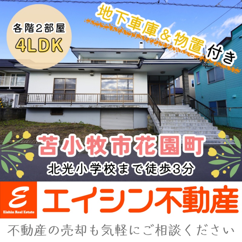 ここに注目!【月々37,964円のお支払い】※お借入の参考例:お借入総額850万円の場合 (当初固定金利3年・金利0.7%・お借り入れ期間20年・ボーナス払いなし) ※その他諸費用発生致します。🔶苫小牧市花園町・子育て世帯にオススメの4LDK中古住宅です😊 🔶北光小学校まで徒歩3分、啓北中学校まで徒歩11分🏫はなぞの認定こども園も徒歩7分と、お子様の通園・通学も安心のロケーションです👌 🔶お車は敷地内1台、車庫に1台の計2台駐車可能🚘地下には広々とした物置スぺースもあり、タイヤ・自転車・趣味の道具もスッキリと収納できます🎵 🔶全室6帖以上&各階2部屋の間取りは、ご家族の成長に合わせてフレキシブルに活用可能👍 🔶シューズボックスや床下収納に加えて、全居室に収納が付いているため、整理整頓もしやすいです🌼 🔶徒歩10分圏内にはマックスバリュ・フードD・ツルハドラッグ・郵便局・信用金庫・勤医協苫小牧病院等も揃っており、暮らしに便利な施設が充実しています🌈 🔶リフォームのご相談も承っております!ご内覧のご希望・詳細・ご質問はエイシン不動産までお気軽にお問い合わせ下さい😊
