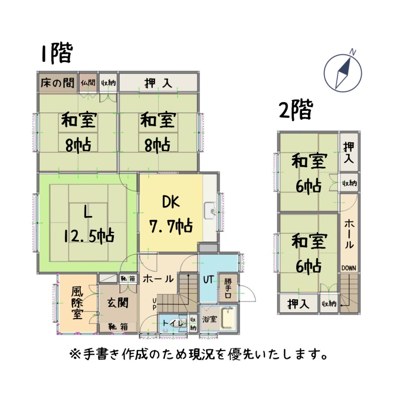 | 間取り | 4LDK1階:L12.5帖 DK7.7帖 和室8帖 和室8帖 / 2階:和室6帖 和室6帖 |