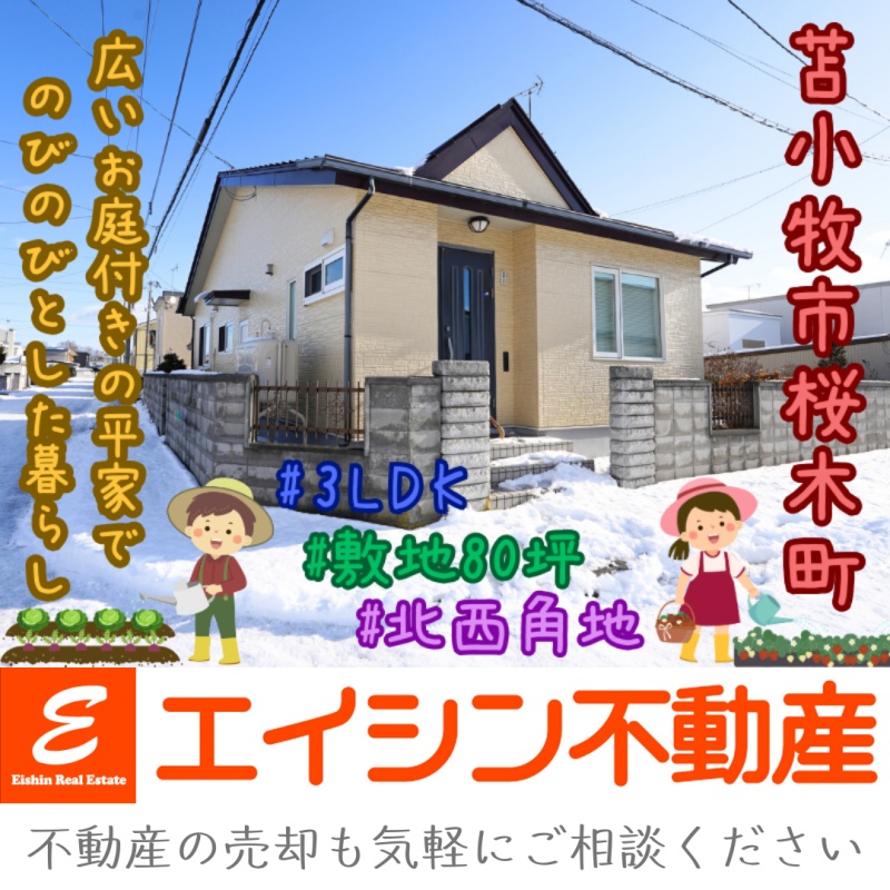 ここに注目!【月々44,417円のお支払い】※お借入の参考例:お借入総額980万円の場合 (当初固定金利3年・金利0.85%・お借り入れ期間20年・ボーナス払いなし) ※その他諸費用発生致します。🔶苫小牧市桜木町に人気の平家3LDKが登場しました😊 🔶敷地約80坪の北西角地で、広いお庭でガーデニングや家庭菜園などを楽しみたい方にオススメの物件です✨ 🔶現状は車庫駐車1台可能ですが、塀や庭を工事した場合は増台も可能(※工事代別料金)🚘 🔶15.5帖のLDKは南向きで日当たりも良く、ご家族での団らんを温かく包み込みます☀ 🔶キッチンは火を使わずに調理できるIH3口コンロ🍳調理器具等の収納に便利な吊戸棚や床下収納もございます🎵 🔶モニターホン・温水洗浄トイレ・シャンプードレッサー・全居室収納などの暮らしを快適にする設備も充実👌 🔶徒歩10分圏内にはコンビニ・金融機関・ドラッグストア・病院・郵便局などが揃っており、保育園・認定こども園・小中学校も徒歩15分圏内と利便性良好です🌈 🔶リフォームのご相談も承っております!詳細はエイシン不動産までお気軽にお問い合わせ下さい😊