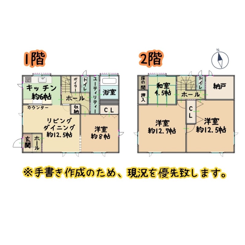 | 間取り | 4SLDK1階:K6帖 LD12.5帖 / 2階:和室4.5帖 洋室12.7帖 洋室12.5帖 / その他:洋室8帖 |