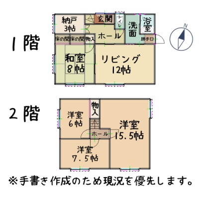 | 間取り | 4SLDK1階:LDK12帖 和室8帖 S3帖 / 2階:洋室7.5帖 洋室6帖 洋室15.5帖 |