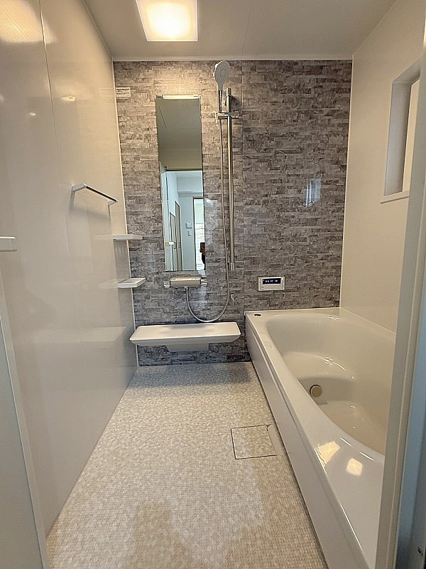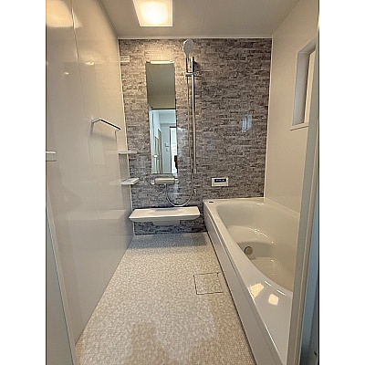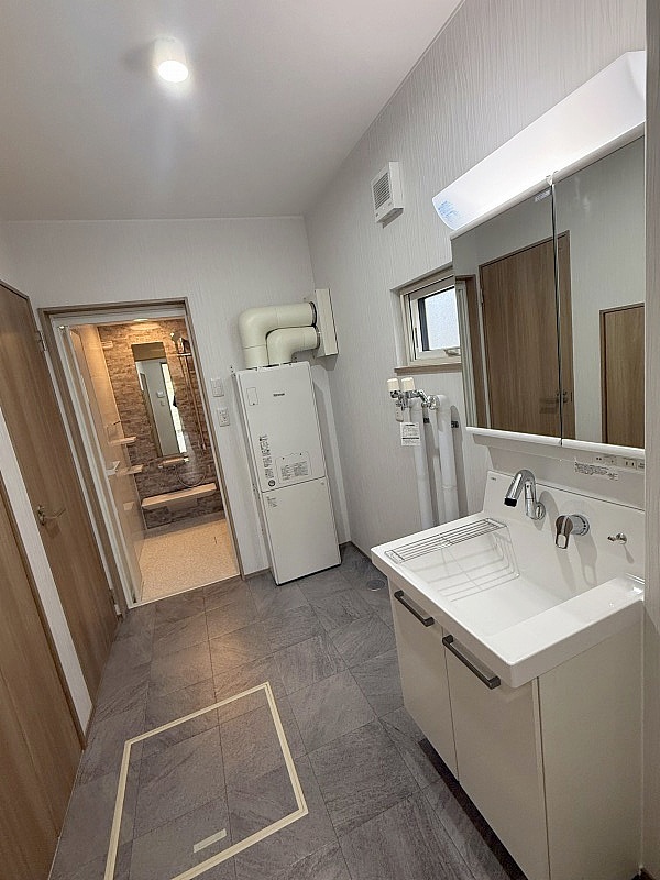 ボイラーはエコジョーズに交換済み!洗面台はシャワー水栓と3面鏡収納付き、床はシックな大理石調に仕上げました!