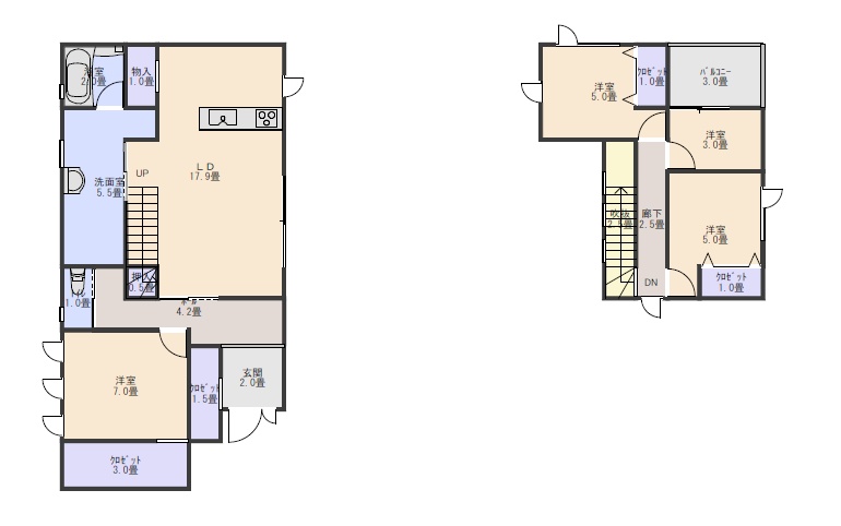 | 間取り | 4LDK1階:LDK17.5帖 洋室7帖 / 2階:洋室5.2帖 洋室5.2帖 / その他:洋室3帖 |