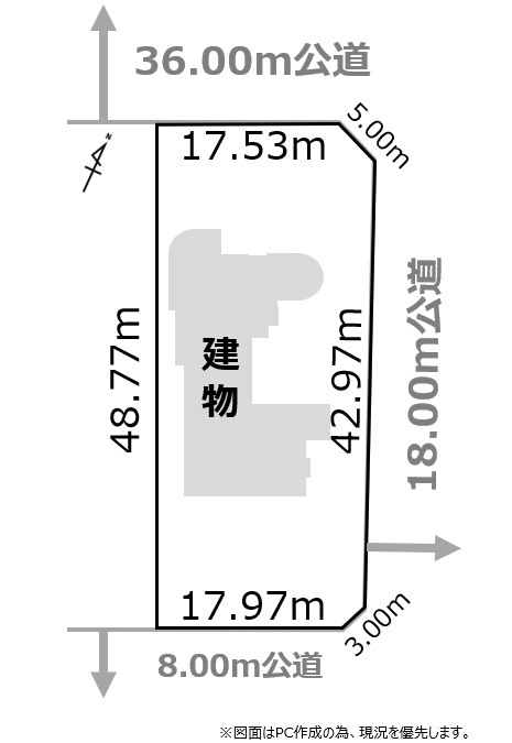 - 北西側幅36.00mの公道に17.53m接道