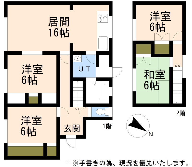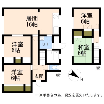 | 間取り | 4LDK1階:LDK16帖 洋室6帖 洋室6帖 / 2階:洋室6帖 和室6帖 |