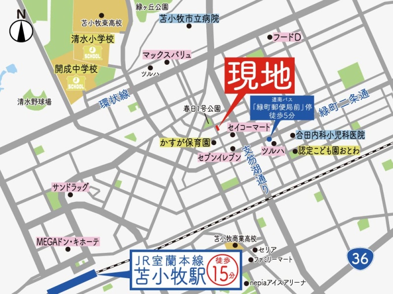 - 苫小牧駅JR日高本線、JR千歳線、JR室蘭本線徒歩15分(約1.2km)