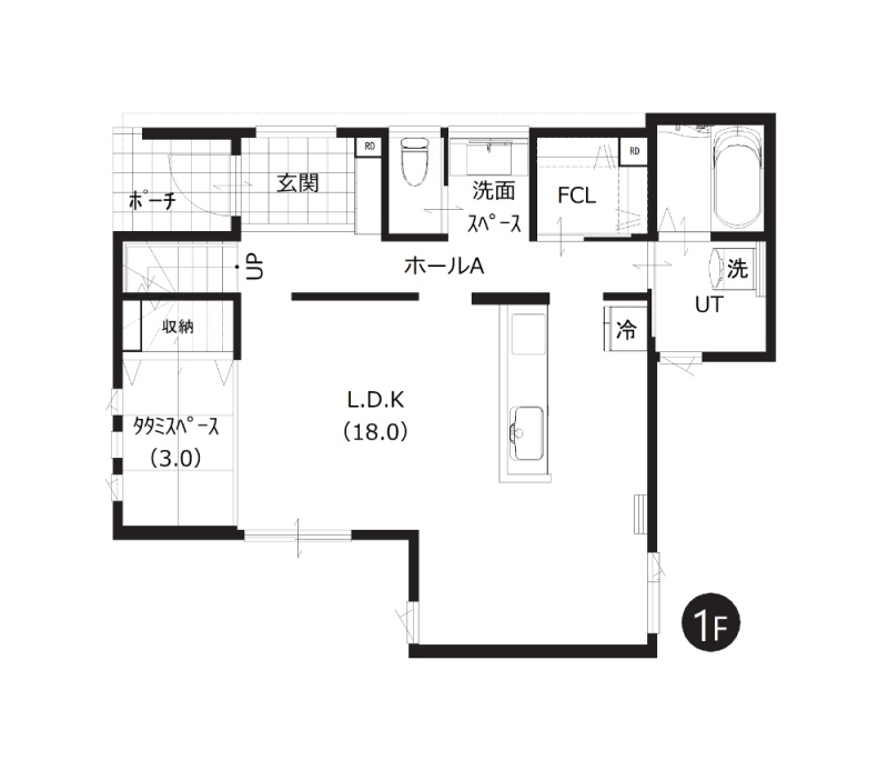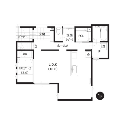【1階間取図】家族が自然と集まるLDKは広々約18帖。