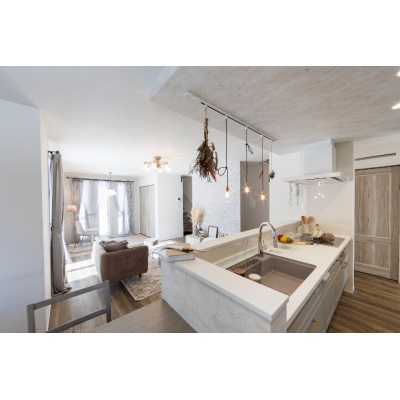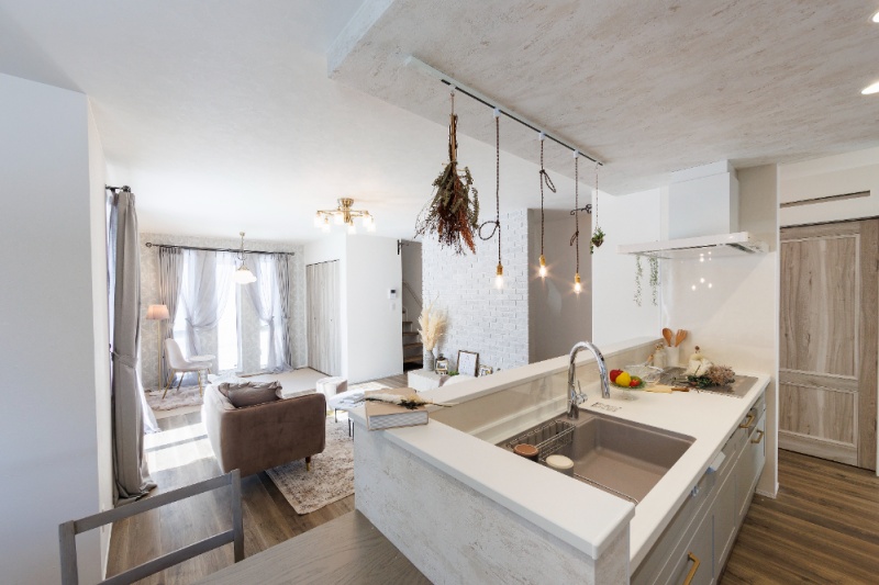 【LDK】リビングのご家族と会話が楽しめる対面キッチンを採用。(2025年2月撮影)