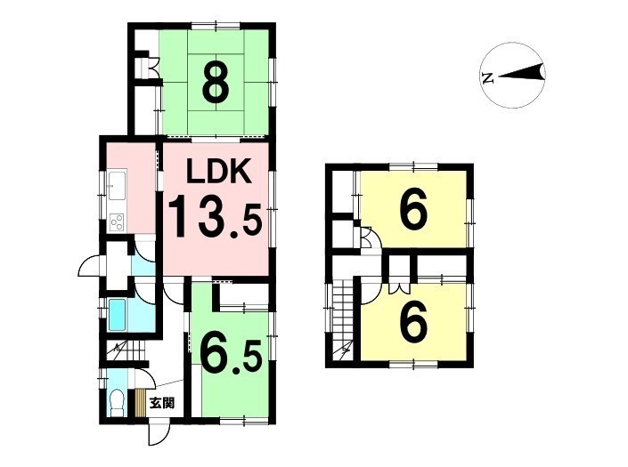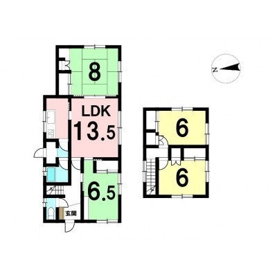 | 間取り | 4LDK1階:LDK13.5帖 和室8帖 和室6.5帖 / 2階:洋室6帖 洋室6帖 |