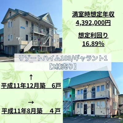 ここに注目!💚LINEでのお問い合わせはこちらの物件NOをお知らせください→4166280 光洋町 2棟売り💚 🌲🏡【満室時想定年収:4,392,000円、想定利回り:16.89%】🏡🌲 🌹苫小牧西エリア・光洋町の閑静な住宅街にある、2棟売り収益アパート🌹【リゾートハイム103】土地面積137.88㎡(41.70坪)、建物面積132.48㎡(40.67坪)1999年(平成11年)8月築 4戸🎶【ギャラント1】土地面積170.96㎡(51.71坪)、建物面積271.07㎡(81.99坪)1999年(平成11年)12月築 6戸✨物件の詳細等のお問い合わせはハウスドゥまで、気軽にいつでもご連絡ください!!😊※敷地境界について、既存のブロック塀や庭木等の越境がある場合はその越境を解消出来ない可能性があり、その場合は現況でのお引渡しとなります。