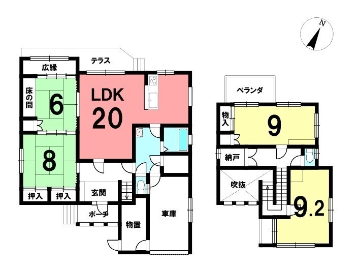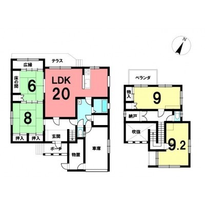| 間取り | 4SLDK1階:LDK20帖 和室8帖 和室6帖 / 2階:洋室9.2帖 洋室9帖 |