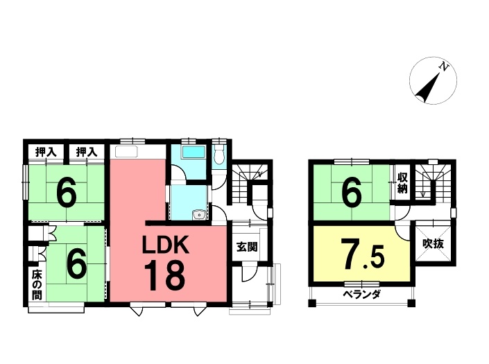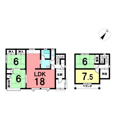 | 間取り | 4LDK1階:LDK18帖 和室6帖 和室6帖 / 2階:洋室7.5帖 和室6帖 |