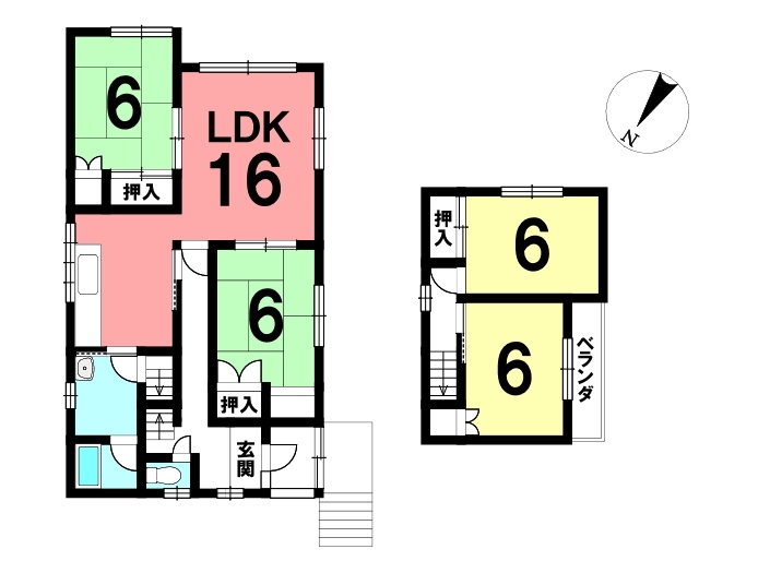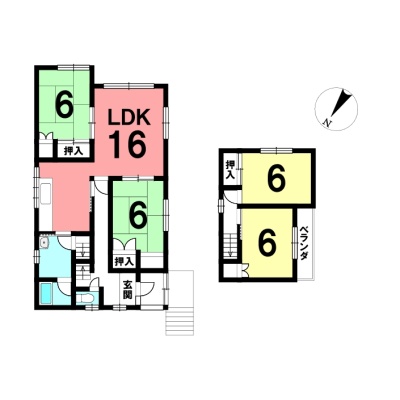 | 間取り | 4LDK1階:LDK16帖 和室6帖 和室6帖 / 2階:洋室6帖 洋室6帖 |