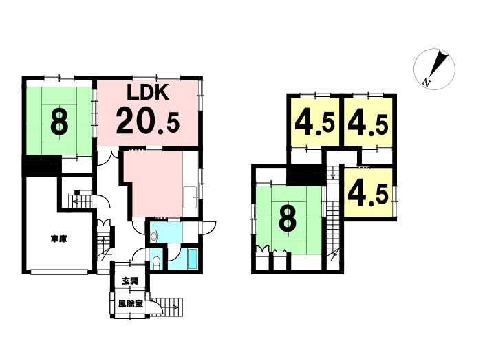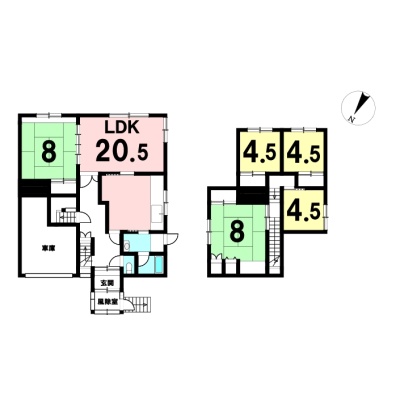 | 間取り | 5LDK1階:LDK20.5帖 和室8帖 / 2階:和室8帖 洋室4.5帖 洋室4.5帖 洋室4.5帖 |
