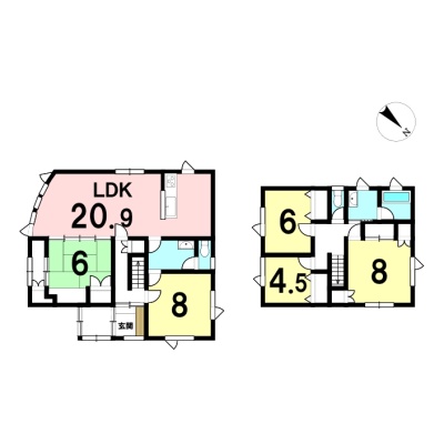 | 間取り | 5LDK1階:LDK20.9帖 和室6帖 洋室8帖 / 2階:洋室8帖 洋室6帖 洋室4.5帖 |