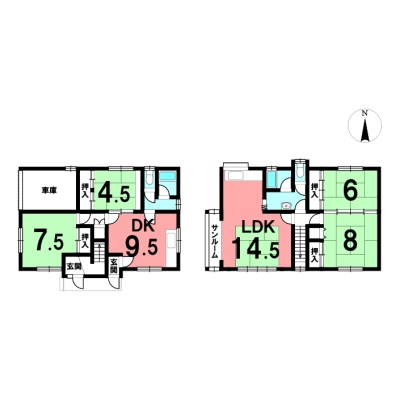 | 間取り | 二世帯型1階:DK9.5帖 和室7.5帖 和室4.5帖 / 2階:LDK14.5帖 和室8帖 和室6帖 |