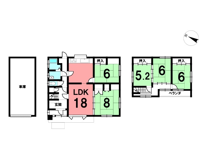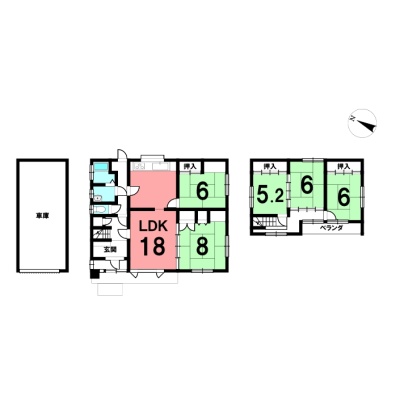 | 間取り | 5LDK1階:LDK18帖 和室8帖 和室6帖 / 2階:和室6帖 和室6帖 和室5.2帖 |