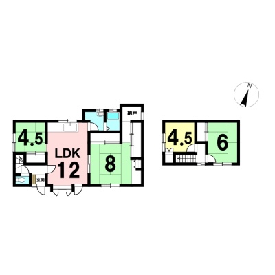 | 間取り | 4LDK1階:LDK12帖 和室4.5帖 和室8帖 / 2階:和室6帖 洋室4.5帖 |