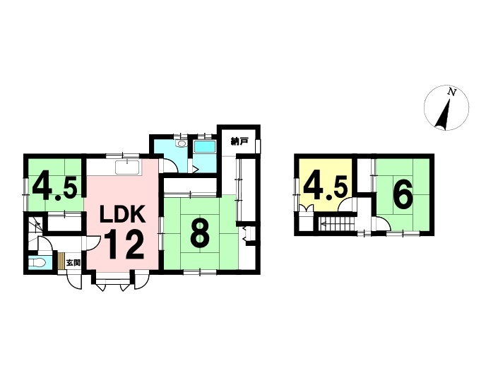 | 間取り | 4SLDK1階:LDK12帖 和室8帖 和室4.5帖 / 2階:和室6帖 洋室4.5帖 |