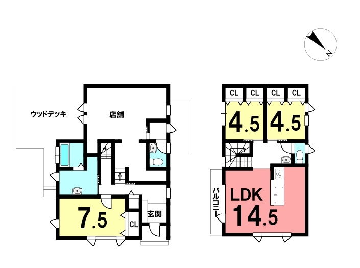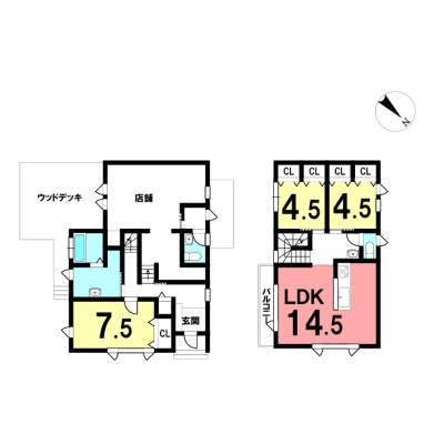 | 間取り | 3LDK1階:洋室7.5帖 / 2階:LDK14.5帖 洋室4.5帖 洋室4.5帖 |