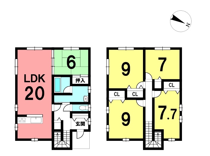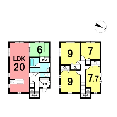 | 間取り | 5LDK1階:LDK20帖 和室6帖 / 2階:洋室9帖 洋室9帖 洋室7.7帖 洋室7帖 |