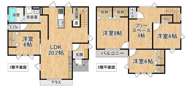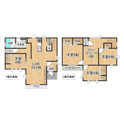 | 間取り | 4SLDK1階:LDK20.2帖 洋室6帖 / 2階:洋室8帖 洋室6帖 洋室6帖 その他8帖 |