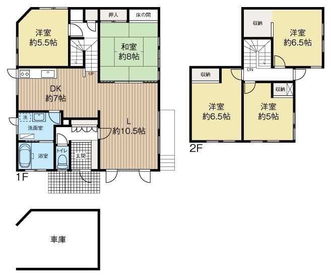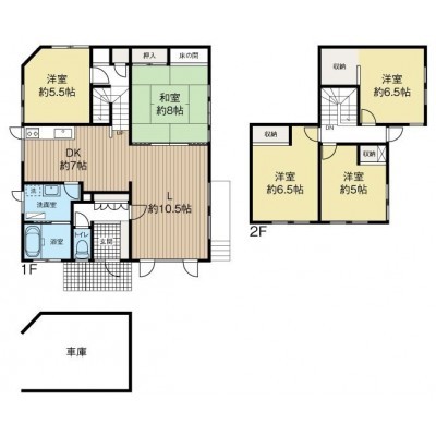 | 間取り | 5LDK1階:L10.5帖 DK7帖 和室8帖 洋室5.5帖 / 2階:洋室6.5帖 洋室6.5帖 洋室5帖 |