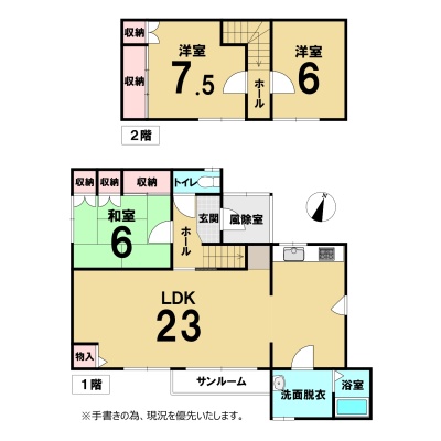 | 間取り | 3LDK1階:LDK23帖 和室6帖 / 2階:洋室7.5帖 洋室6帖 |