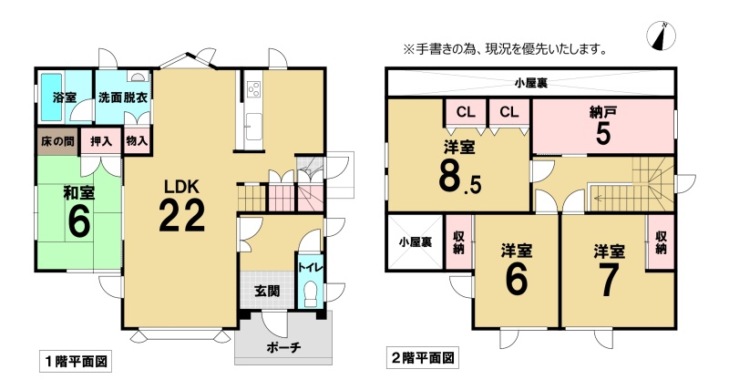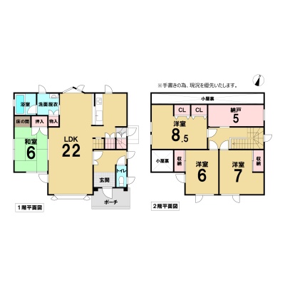 | 間取り | 4SLDK1階:LDK22帖 和室6帖 / 2階:洋室8.5帖 洋室7帖 洋室6帖 S5帖 |