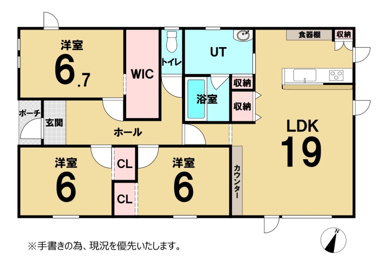 洋室【6.7帖】:ウォークインクローゼット付き!収納豊富な3LDK