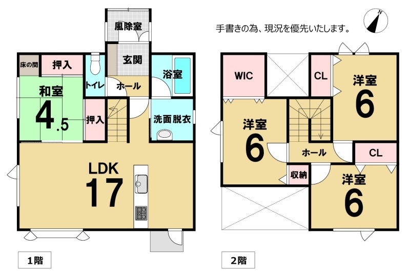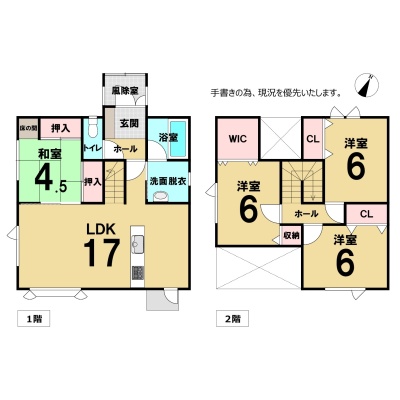 | 間取り | 4LDK1階:LDK17帖 和室4.5帖 / 2階:洋室6帖 洋室6帖 洋室6帖 |