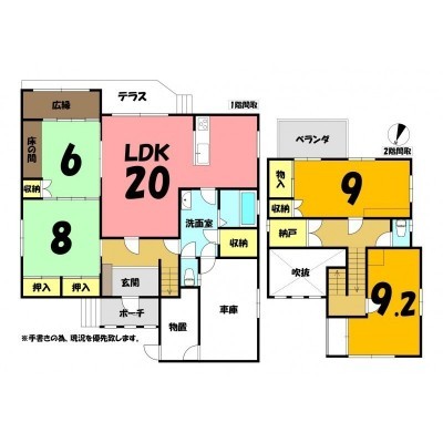 | 間取り | 4SLDK1階:LDK20帖 和室6帖 和室8帖 / 2階:洋室9帖 洋室9.2帖 |