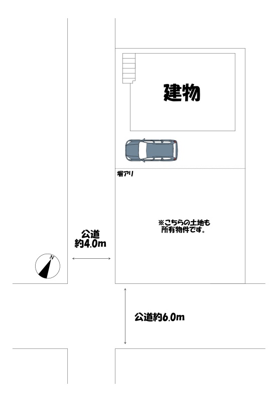土地の全体図です。建物と土地の間に塀がございますが、当物件の土地です。